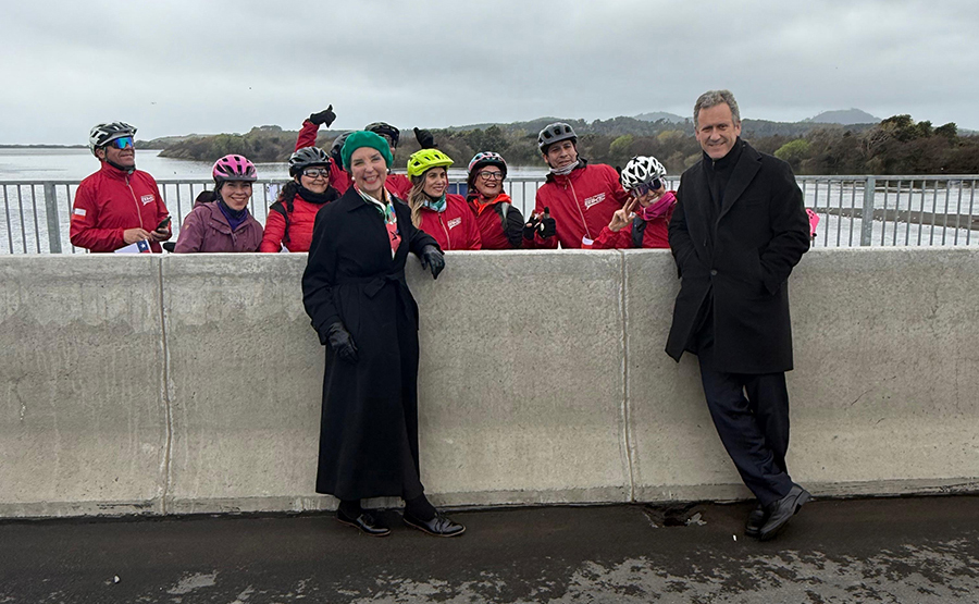 La presidenta de Copsa, Gloria Hutt, y el ministro de Transportes, Juan Carlos Muñoz, junto a un grupo de ciclistas que dieron el vamos al uso de la ciclovía del Puente Industrial.