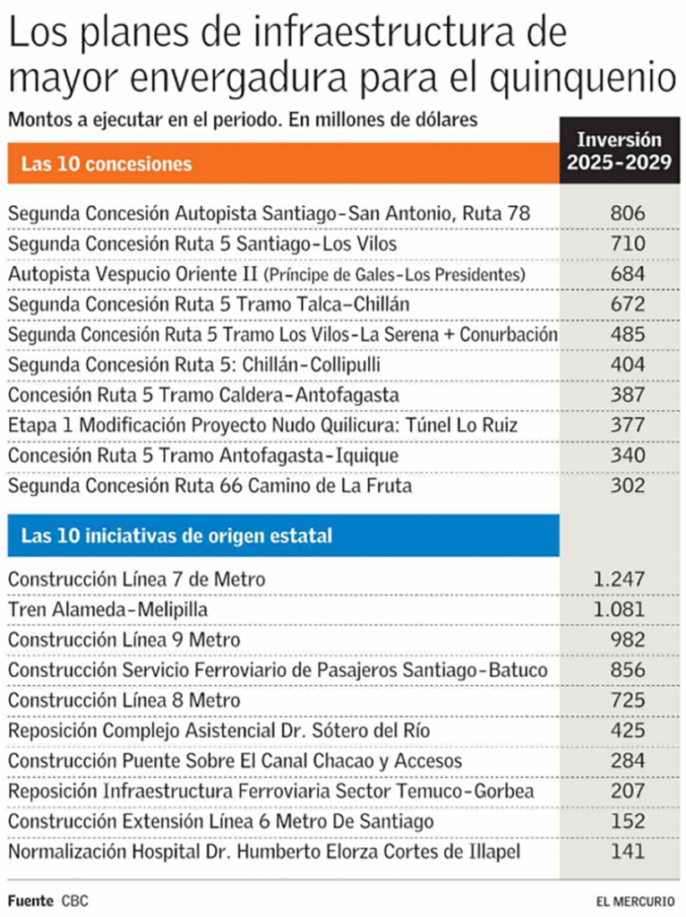 Los 10 proyectos de mayor envergadura con financiamiento estatal totalizan inversiones por US$ 6.100 millones a 2029. En tanto, el top ten costeado vía concesiones suma US$ 5.167 millones.