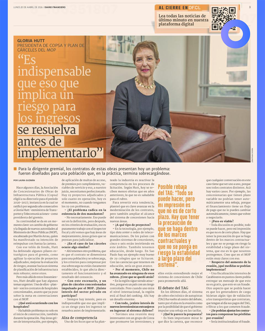 Hace algunos días, la Asociación de Concesionarios de Obras de Infraestructura Pública (COPSA) eligió a su directorio para el período 2026-2027; instancia en la cual se ratificó por segundo año consecutivo a Gloria Hutt -exministra de Transportes y Telecomunicaciones- como presidenta del gremio.